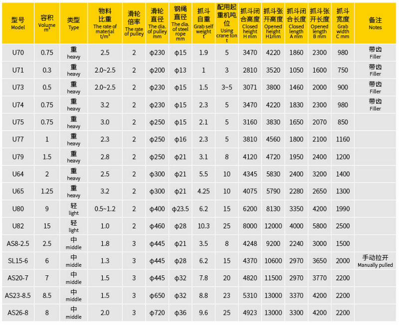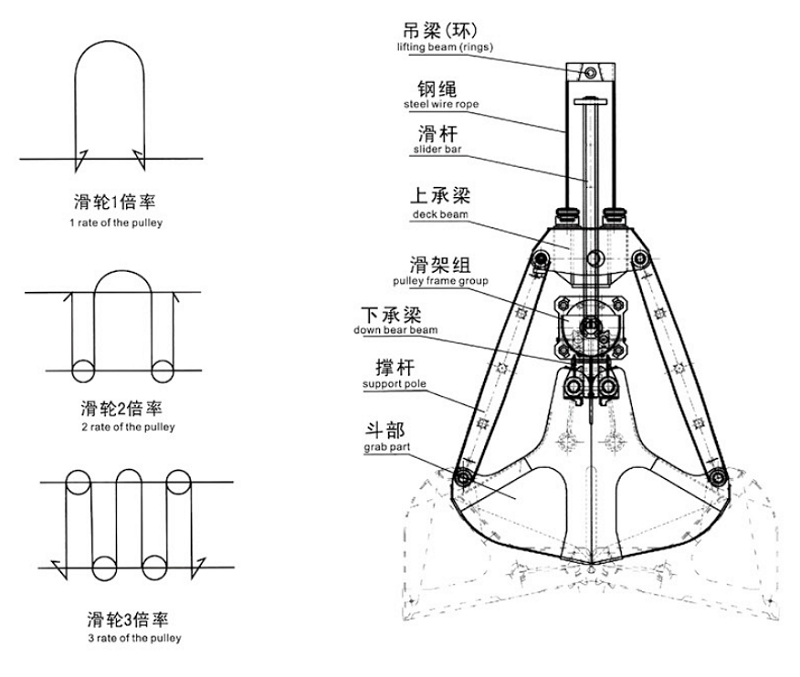 注:?jiǎn)卫K抓斗無(wú)法空中張合,手拉式和遙控式可以實(shí)現(xiàn)在控制打開。