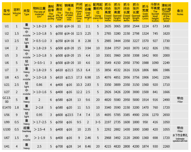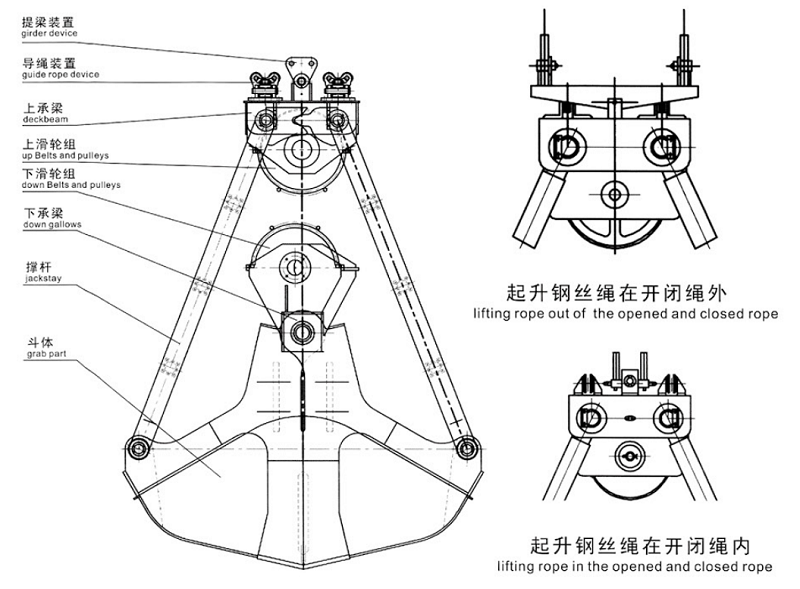 工作開始時,支持鋼絲繩將抓斗起吊在適當?shù)奈恢蒙希缓蠓畔麻_閉鋼絲繩,這時靠下橫梁的自重迫使斗部以下橫梁大軸為中心將斗部打開,當斗部開到兩耳板的碰塊相撞時,即斗部打開到最大極限。開斗時,上橫梁滑輪和下橫梁滑輪中心距加大,然后支持鋼絲繩落下,將已打開的抓斗,落在要抓取的松散堆積物上面,再收繞開閉鋼絲繩,將上橫梁滑輪與下橫梁滑輪的中心距恢復(fù)到原來的位置,這樣就完成了抓取物料的過程。在閉合的斗部里已經(jīng)裝滿了物料,最后同時提升開閉和支持鋼絲繩,整個抓斗即被吊起,經(jīng)起重機移動到所需卸料場地上,開斗卸下所抓取的物料。