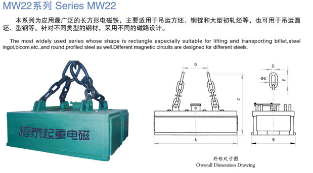 本系列為應(yīng)用最廣泛的長方形電磁鐵,主要適用于吊運(yùn)方坯,鋼錠和大型初軋坯等,也可適用于吊運(yùn)圓坯,型鋼等。針對不同類型的鋼材,采用不同的磁路設(shè)計。