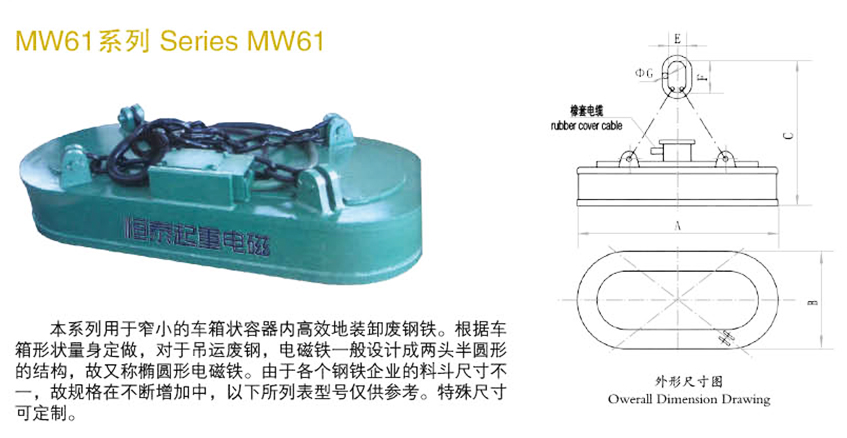 本系列用于窄小的車箱狀容器內(nèi)高效的裝卸廢鋼鐵。根據(jù)車箱形狀量身定做,對于吊運廢鋼,電磁鐵一般設計成兩頭半圓形的結構,故又稱橢圓形電磁鐵。用于各個鋼鐵企業(yè)的料斗尺寸不一,故規(guī)格在不斷增加中,特殊尺寸可定制。